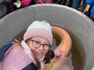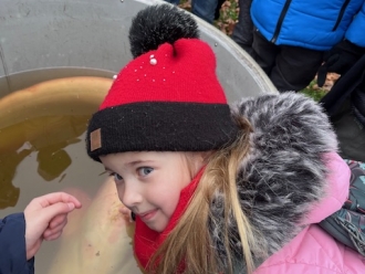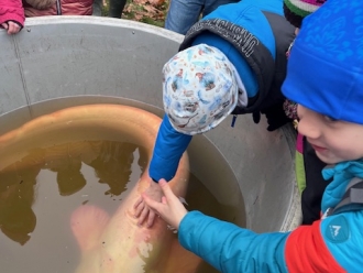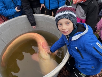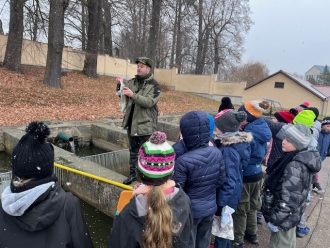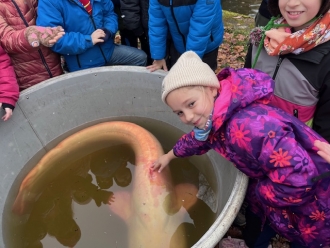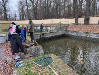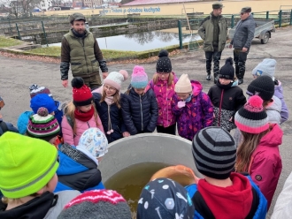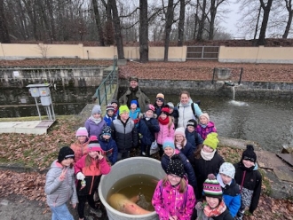 Ve čtvrtek 20 listopadu jsme měli možnost s dětmi navštívit Sádky Třeboň. Pozval nás Aniččin tatínek na krásnou akci - vypouštění sumce Fandy do rybníka Svět. Zblízka jsme viděli, jak takový sumec vypadá a ti odvážní si ho mohli i pohladit. Eliška říkala, že je na dotyk jako želé :). Pan Kukačka nám pak ukázal celé sádky, povídal nám o chovu ryb a vylovil pro nás různé druhy, takže děti teď už poznají kapra, sumce, štiku, lína, okouna a další. Celou dobu poletoval sníh, byla zima, ale děti byly moc hodné a akce se nám moc líbila.