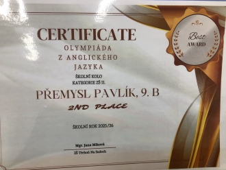 V okresním kole olympiády z AJ naši školu budou reprezentovat v DDM v Jindřichově Hradci (dne 12. 2. 2026) Tobiáš Sokolík a Barbora Chmelová. Budeme jim držet palce!!!